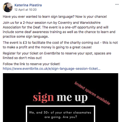 The session was aimed at staff and students from the University of Warwick, whereby individuals were targeted through the use of polls in the University’s Facebook pages and by placing posters across campus. We felt that social media was an effective platform to use, considering its relevance and accessibility. The polls asked if people would be interested in attending a free sign language session on campus if it were to be offered. The polls allowed us to measure initial levels of interest in our idea and further engagement was measured by the number of individuals who booked to attend the seminar.